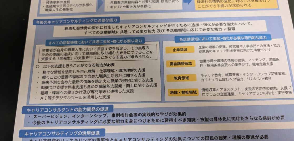 厚生労働省は21日、「経済社会情勢の変化に対応したキャリアコンサルティングの実現に関する研究会」報告書を公表した。経済社会情勢の変化に対応したキャリアコンサルティングを行うために追加・強化が必要な能力を「すべての活動領域に共通して必要な能力」と企業、需給調整、教育などの「各活動領域に応じて必要な能力」に分けて整理。キャリアコンサルタントの能力開発促進に向けて、スーパービジョンやインターンシップ、事例検討会などの実践的な学習機会が効果的とし、キャリアコンサルティングの活用促進には、キャリア形成やリスキリングの重要性、キャリアコンサルティングの効果について、国民の認知と理解を高めることが必要であるとした。